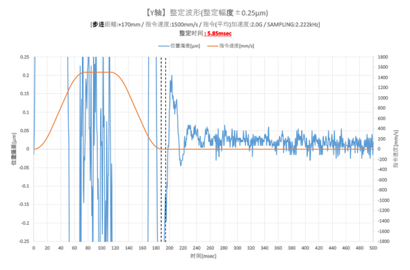 整定波形(整定幅度±0.25μm) 整定时间 : 5.85msec 步进距離:+170mm / 指令速度:1500mm/s / 指令(平均)加速度:2.0G / SAMPLING:2.222kHz